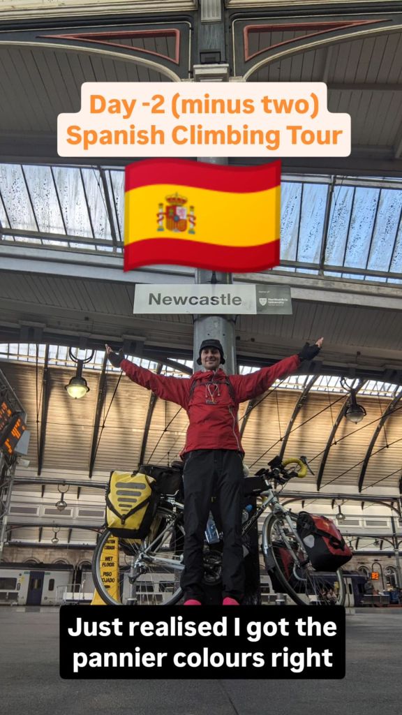 My plan is to cycle around climbing venues in Spain and hope to find climbing partners on arrival at each. I’m carrying camping gear so that I have the flexibility to not need to book accommodation and can ride further when the sun shines.
